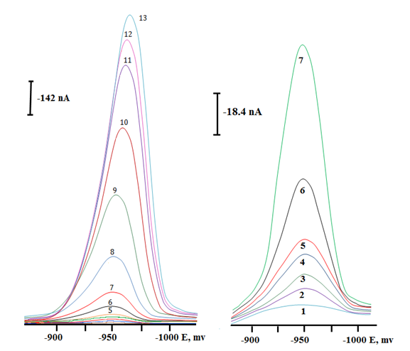 Fig. 4: The effect of time pulse (t. pulse) on the polarograms of RSV (192.56 ng. mL-1) using DPPA at SMDE at: (1) 35; (2) 40; (3) 45; (4) 50; (5) 60; (6) 70; (7) 80; (8) 90; (9) 100, (10) 110, (11) 120, (12) 130 and (13) 140 ms (Purge gas N2, Purge time 100 s, Scan rate 5.0 mV/s, pH=1.5, t. meas. 32 ms, U. amplitude -90 mV, t. step 1.6 s, temperature of solution 25°± 5°C and Na2HPO4 buffer)