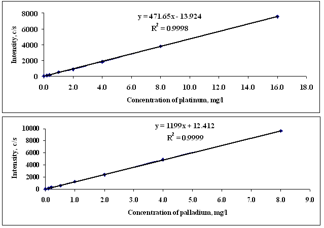 Seven point calibration curve was plotted for the standard solutions of both platinum and palladium vs emission intensity (c/s) in the concentration range from 0.2 µg/ml to 16 µg/ml for platinum and 0.1 µg/ml to 8 µg/ml for palladium. Each of the calibaration solution was measured five times and the average of the five readings for each of the calibarion solution was used for plotting the calibration curve (Table 4).