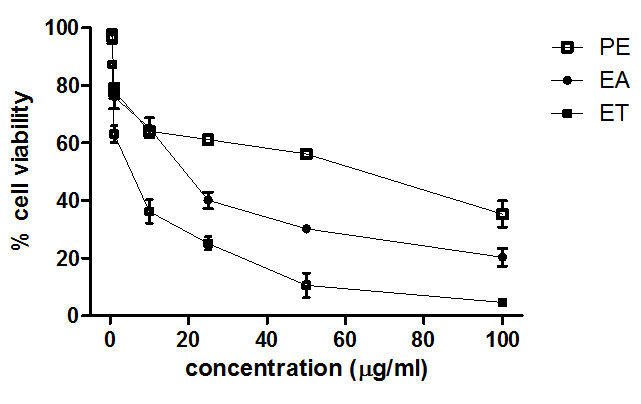 Fig. 1: Percentage viability of Huh-7 cells after treatment with PE, EA and ET extracts of SP flower (0.5, 1, 10, 25, 50 and 100 µg/ml) for 72 h prior to MTT assay to determine potential anticancer effect. The calculated EC50 values of PE, EA and ET extracts were 43.16, 18.33 and 4.19 µg/ml, respectively. Statistically significant differences were observed between PE and EA extracts (paired t-test, P<0.05 at 25, 50 and 100 µg/ml concentrations) and EA and ET extracts (paired t-test, P<0.05 at and above 10.0 µg/ml concentrations)