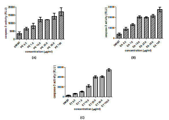 Characterization of this property of these extracts was analyzed through caspase-3 activity, expressed in RLU and compared against DMSO-containing vehicle control. This assay is an indirect indication for the measurement of apoptotic activity in treated cells as a phenotype of anti-cancer potential. All the extracts showed dose dependent increase in caspase-3 enzymes. ET extract showed highest induction on caspase-3 enzyme (two and three times higher than EA and PE extracts, respectively) whereas EA extract expressed moderate effect on caspase-3 (fig. 2). Caspase-3 is the key enzyme responsible for programmed cell death through cleavage and inactivation of structural constituents and fragmentation of genomic DNA of cancerous cells [20].Both EA and ET extracts showed increase in caspase-3 enzyme level which signified their antiproliferative potential.