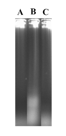 Fig. 3: Huh-7 cells (1x106 cells/ml) were treated with EA & ET at 10 µg/ml for 24 h. The isolated DNA samples were electrophoresed for 2 h at 20V in 1% agarose gel and stained with ethidium bromide. We found intact DNA for control group (A) whereas degraded DNA as smear or broken ladder in EA (B) and ET (C) groups