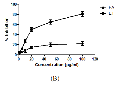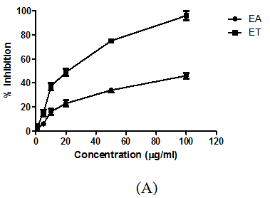 We performed DPPH, H2O2 and. OH assays to measure scavenging properties of extract. According to fig. 4, it was observed that both extract had % inhibition effects in a dose dependent manner. However, ET extract showed higher inhibitory effect than EA extract. ET extract produced from 5 to 80% inhibition at concentrations from 1 to 100 µg/ml whereas EA extract had only 5 to 20% inhibition in the same concentration (fig. 4A to 4C). PE extract had no such effect (data not shown).