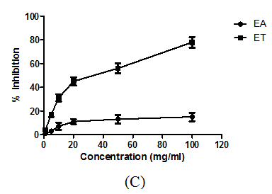 Fig. 4: Free radical scavenging assays [(A) DPPH, (B) H2O2 and (C) hydroxyl radical] of EA and ET extracts from 1 to 100 µg/ml concentration