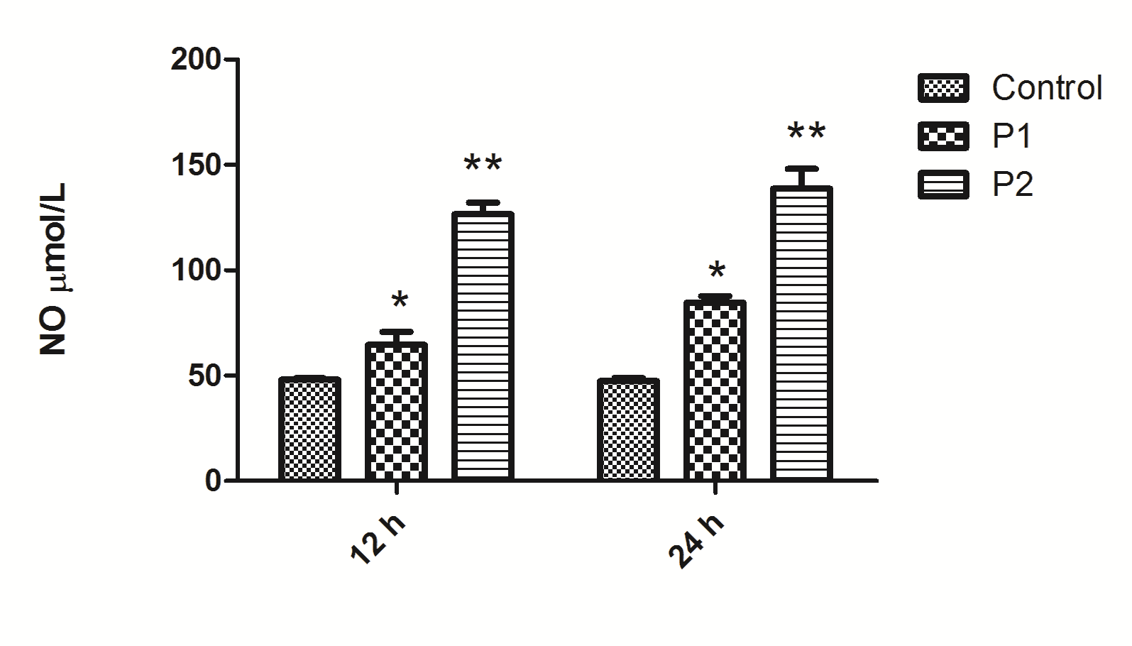 Monocrotophos incubation in HaCaT cells resulted in significant release in NO in P1 and P2 treatments compared with control in a dose dependent manner. At 12 h of incubation P1 and P2 treatments resulted in 1.34 and 2.63 times higher secretion of NO when compared with the control.