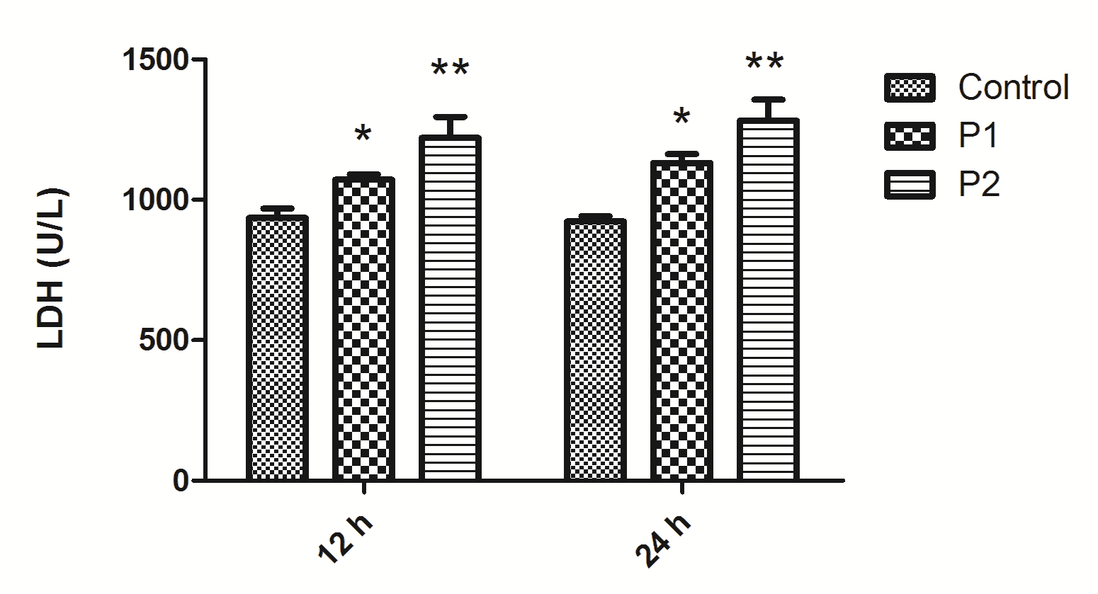 P1 and P2 treatments resulted in 1.14 and 1.30 times increase in LDH release at 12 h incubation higher than the control. At 24 h incubation 1.22 and 1.38 times increase in LDH release was observed, which was higher compared to control (fig. 3).