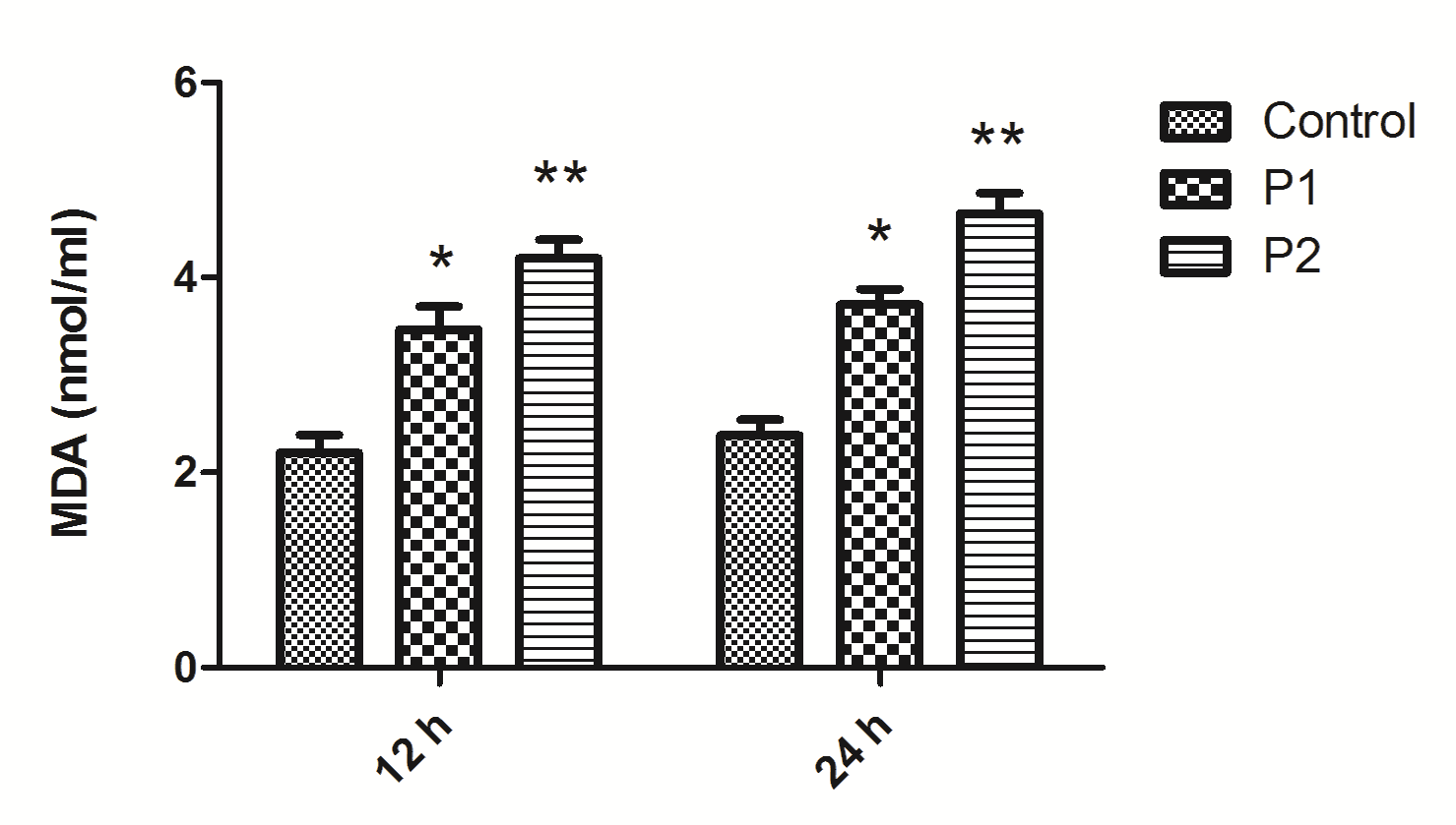 The effect of monocrotophos on oxidative stress in HaCaT cells was examined by investigating MDA intracellular enzymes. In the present study dose dependent toxic effect was observed in all the parameters. To ameliorate the toxicity of pesticides MDA involves in molecular mechanisms. Due to cell membrane damage MDA is released in the medium. At 12 h incubation P1 and P2 treatment resulted in 1.57 and 1.69 times increase in MDA level higher than the control. At 24 h incubation P1 and P2 treatment resulted in 1.76 and 1.95 times increase in MDA level compared with the control (fig. 4).