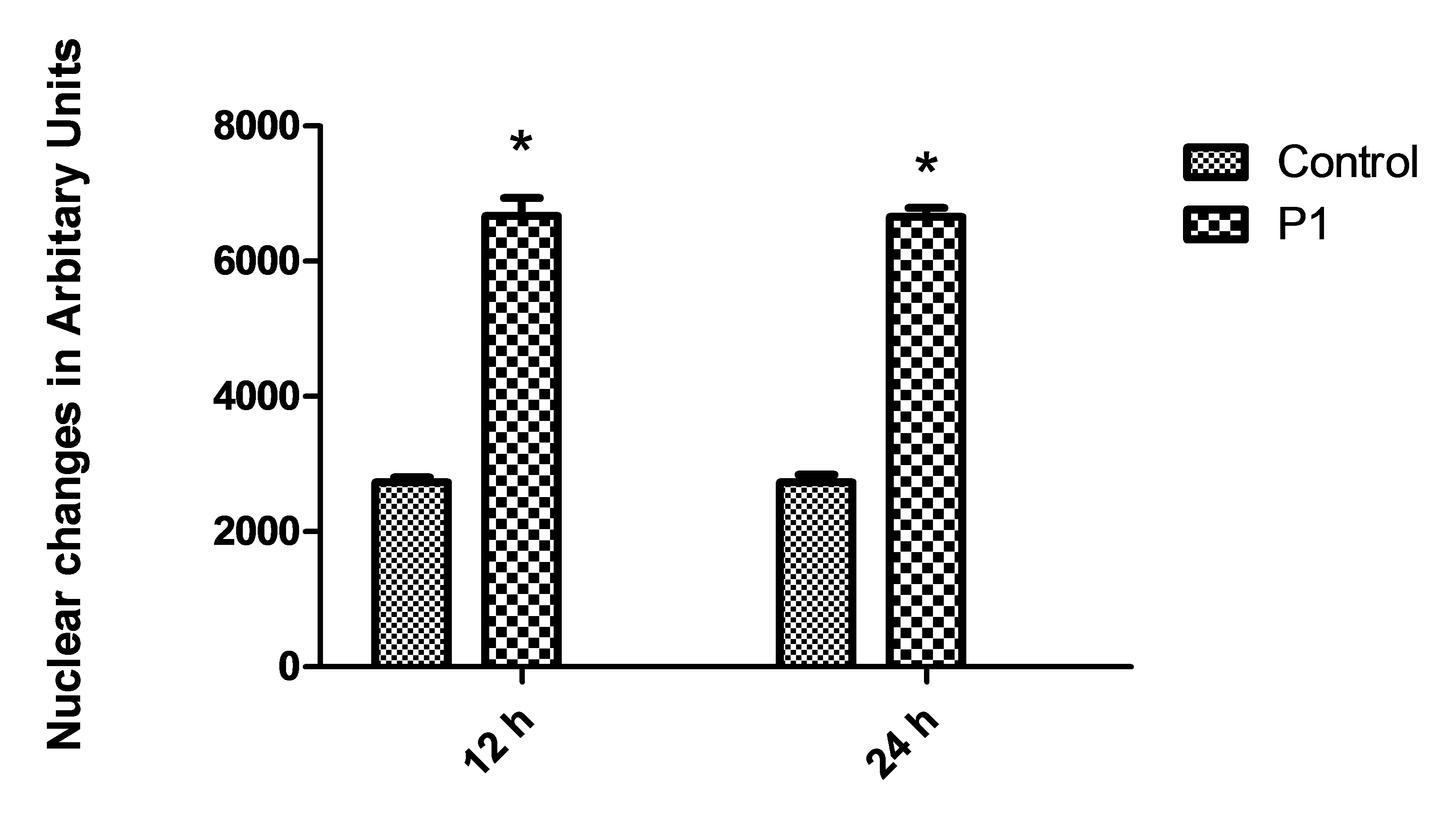 Nuclear changes in arbitrary units were determined for 12 and 24 h incubation. 1/5th IC50 value (P1) was used to determine apoptosis, it was observed that 40 and 41% increase in nuclear changes higher than the control at 12 and 24 h incubation. Significant nuclear changes were not observed at time-dependent manner (fig. 5).