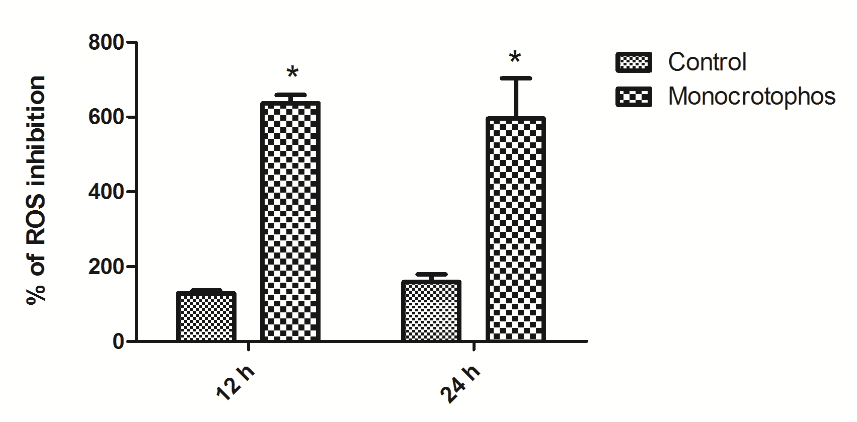 Fig. 4: Oxidative stress induced by monocrotophos in HaCaT cells after 12 and 24 h exposure. Data expressed as mean ± SD. *Denotes a significant difference from the control