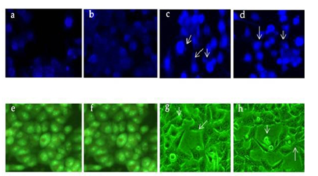 To determine the level of apoptosis in pesticide treated HaCaT cells, DAPI staining was performed as described by Sandra et al [10]. Briefly, the cells were seeded onto glass slides and treated for 12 and 24 h in the concentration 1/5th IC50 of pesticide (P1). Untreated and treated cells were rinsed with phosphate buffered saline (PBS), fixed with ice-cold 10% trichloroacetic acid, and further washed with cold 70, 80, 90% absolute ethanol. The cells were permeabilized with Triton-X (10% v/v) and stained with 1 µg/mL DAPI for 3 min. To reduce the background, the stained cells were washed with PBS, cover-slipped with 90% glycerol and observed under a fluorescence microscope (Labomed- Carl zeiss Lens with blue filter Olympus India).
