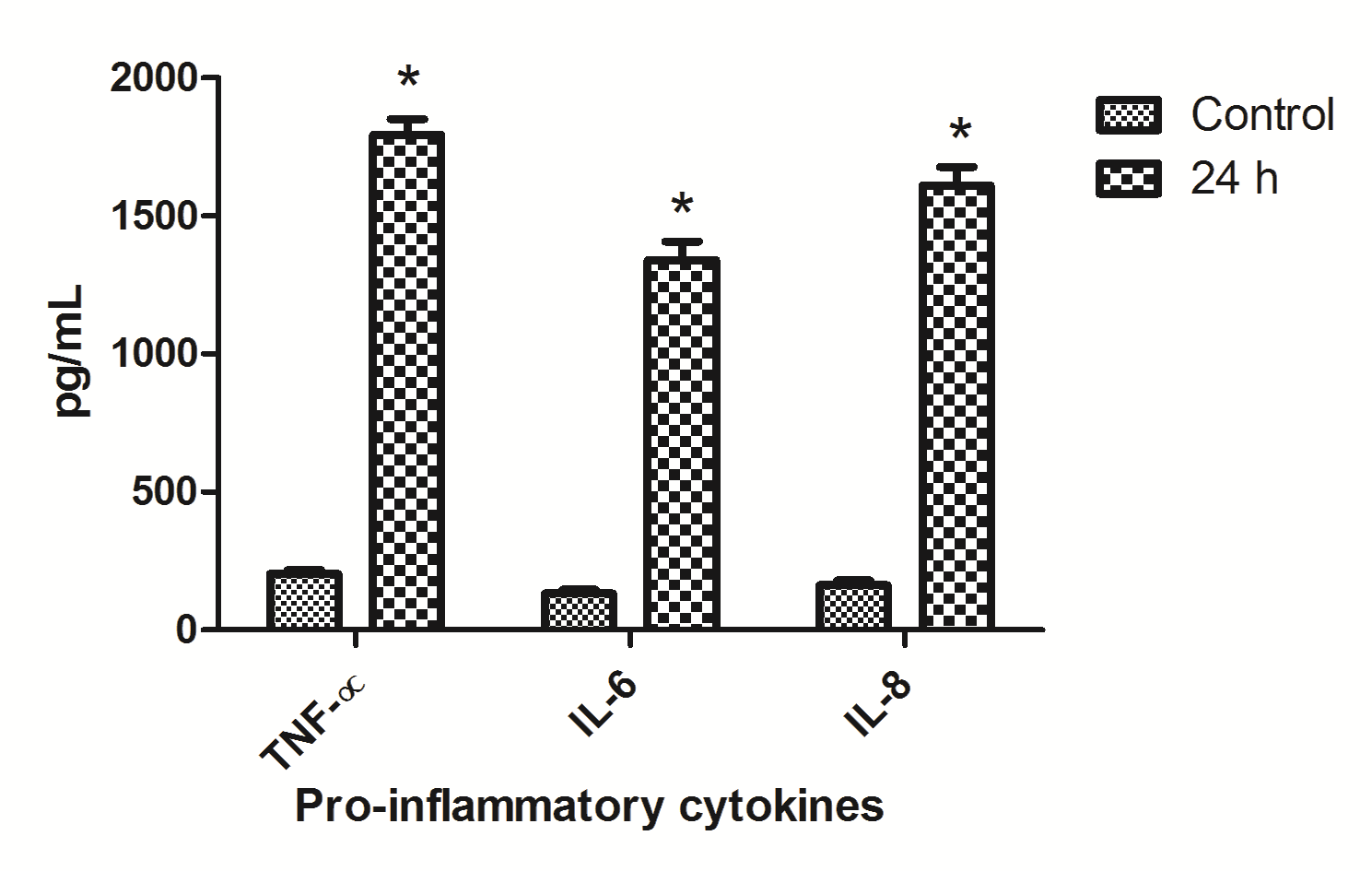 HaCaT cells (106 cells/mL) were seeded and incubated with monocrotophos at 1/5th IC50 concentration (P1) (dissolved in 5% DMSO in serum free DMEM medium). The setup was incubated for 12 and 24 h at 37°C in a humidified atmosphere containing 5% CO2. Unstimulated cells were served as negative control. After 24 h, the quantitative measurement of pro-inflammatory cytokines (IL-8, TNF-α and IL-6) was done in the supernatant of cultured cells using commercial ELISA assay kits (ebiosciences, USA), according to the manufacturer’s recommendations. The samples and standards were all run in duplicates, and the data were then averaged.