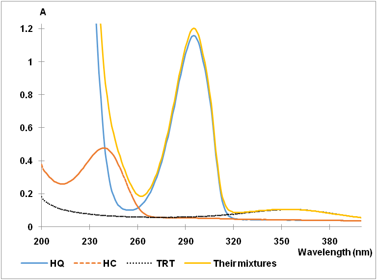 Into a series of 10-mL measured flasks, volumes from the above diluted working standard solutions of HQ, HC and TRT were transferred and diluted with acetonitrile to give the final concentration range stated in the table 2. The absorbance values of each solution were recorded at 1-nm interval in the wavelength range of 200-400 nm using acetonitrile as blank.