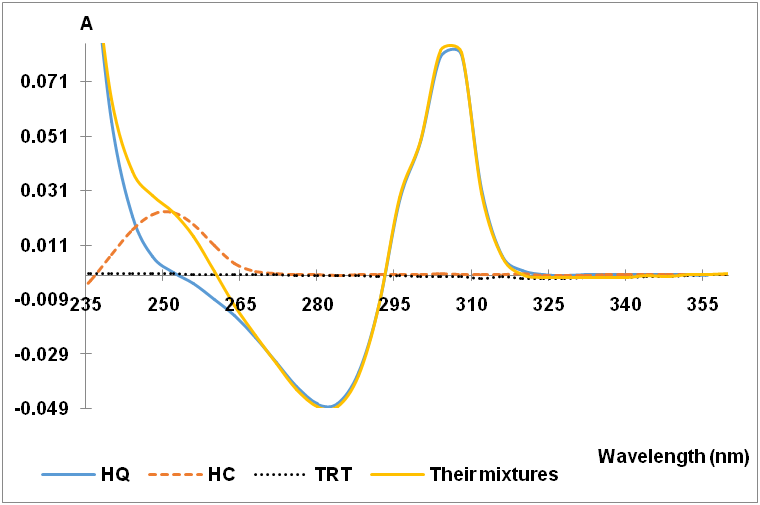 The proposed methods were very simple with minimum manipulation steps, very sensitive, precise, do not need any sophisticated apparatus or a special program and could be easily applied in quality control laboratories as they are having equal accuracy and precision compared to the reported methods for the simultaneous determination of HQ, HC and TRT. Thus, the proposed methods could be successfully applied for the routine analysis of the studied drugs either in their pure bulk powders or in quality control laboratories without any preliminary separation step.