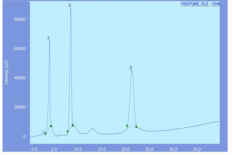 For the selection of the optimal mobile phase composition, the method development started with 100% methanol, where poor resolution between peaks of the studied drugs was found. The mobile phase composition was then adjusted by mixing acetonitrile with methanol in the ratio of 40:60 % v/v, where the poor resolution was also obtained between the first two peaks and broadening of the third peak occurred. It was found that a mobile phase composed of acetonitrile: phosphate buffer (30:70, % v/v) at a pH of 6.1 contributed to better peak shape, separation and resolution, where buffers are usually added to obtain well-resolved symmetrical peaks.