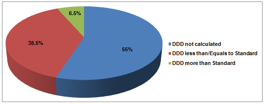 Fig. 1 depicts the appropriateness of benzodiazepines based on defined daily dose were 55% had DDD more than the standard, 38.5% had DDD less than or equal to standard and DDD was not calculated for 6.5% patients.