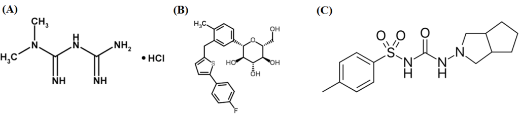 Fig. 1: Structures of (A) Metformin Hydrochloride, (B) Canagliflozin, (C) Gliclazide