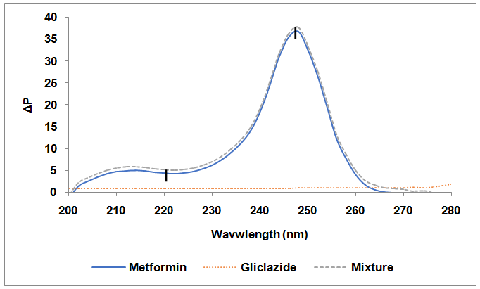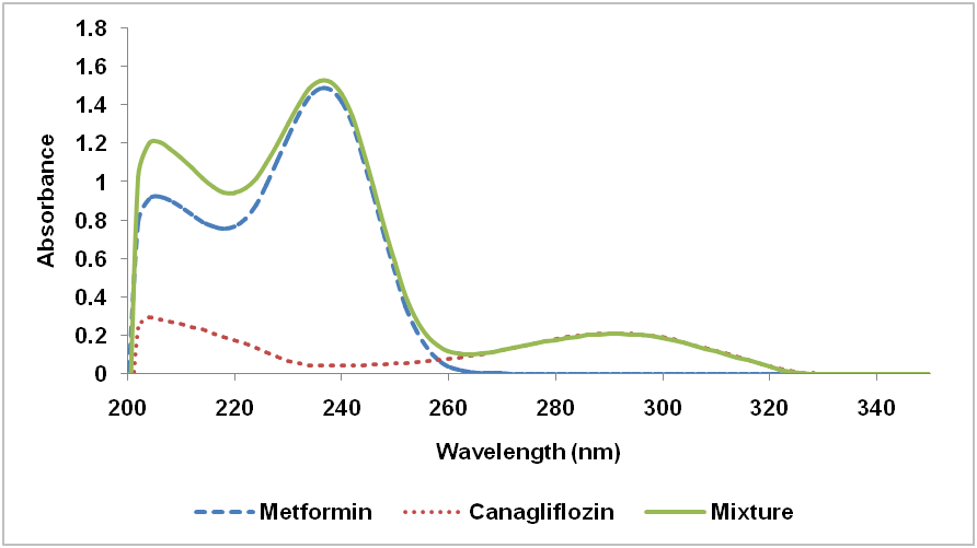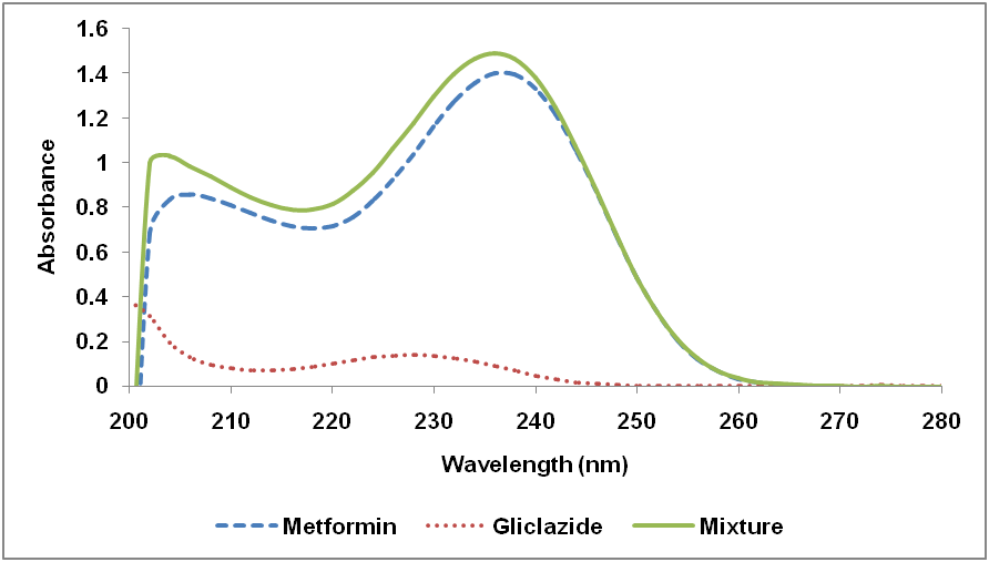 Aliquots of the working standard solutions of MTF and CANA or MTF and GLIC were transferred into a series of 10-ml volumetric flasks and completed to volume with methanol to give synthetic mixtures containing 20:5 µg/ml and 15:2.5 µg/ml, respectively. The absorption spectrum for each mixture was recorded at 1-nm interval in the range of 200-400 nm against methanol as blank and then analysed by the developed method to assay the quantity of both MTF-CANA, or MTF-GLIC in the synthetic mixtures.