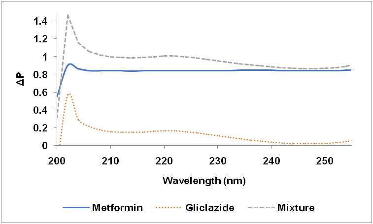Spectrophotometric methods present a good option in the analysis of multicomponent pharmaceutical mixtures based on the availability, simplicity and low cost. Classical UV spectral measurement use is often limited due to the overlapping of spectral peaks unless prior separation and extraction are employed. Several UV spectrophotometric chemometric methods are used in the simultaneous analysis for resolving mixtures based on mathematical processing and manipulations of the absorption spectra [27-34], offering sometimes an alternative to chromatographic methods.