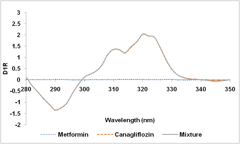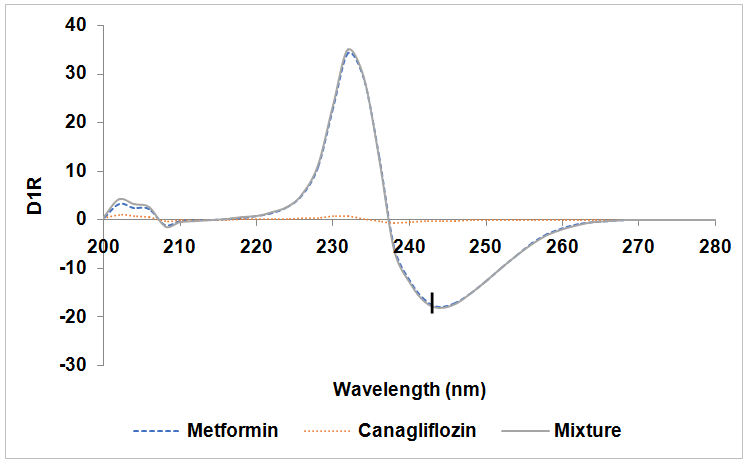 Fig. 10: D1 of the ratio spectra of MTF (16 µg/ml), CANA (5µg/ml) and their binary mixture where the divisor is MTF (18µg/ml)