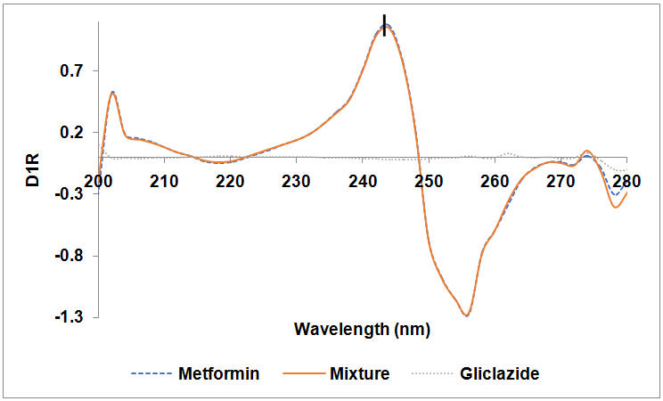 The influence of Δλ was investigated to obtain the optimum wavelength intervals in terms of maximum resolution and sensitivity whereby the Δλ value affects the shape and the position of the peaks to be analysed as well as the zero-crossing point of the other component in the mixture. The D1 curves were traced at 8 nm interval for MTF-CANA and at 6 nm for MTF-GLIC, where other Δλ values gave poor resolution.