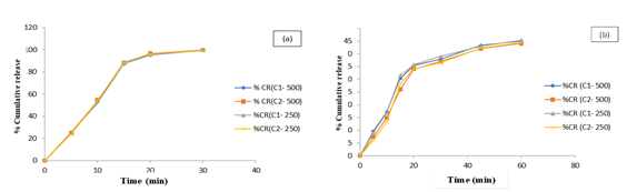 Fig. 1: Dissolution profile of C1–500/250 mg and C2–500/250 mg tablets in (a) 0.01N HCl and (b) Phosphate buffer 6.8