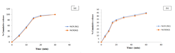 Fig. 2: Dissolution profile of N1 and N2 tablets in (a) 0.01N HCl and (b) Phosphate buffer 6.8