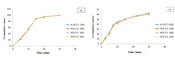 Fig. 3: Dissolution profile of T1-500/300 mg and T2-600/300 mg tablets in (a) 0.01N HCl and (b) Phosphate buffer 6.8