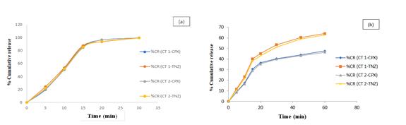 Fig. 4: Dissolution profile of CT 1 and CT 2 tablets in (a) 0.01N HCl and (b) Phosphate buffer 6.8