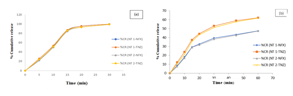 Fig. 5: Dissolution profile of NT 1 and NT 2 tablets in (a) 0.01N HCl and (b) Phosphate buffer 6.8
