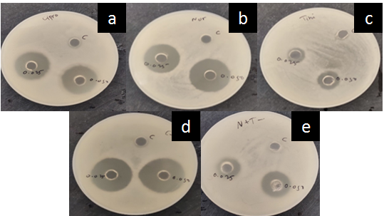 Fig. 6: Antimicrobial zones of inhibition of (a) CFX, (b) NFX, (c) TNZ, (d) CFX+TNZ and (e) NFX+TNZ