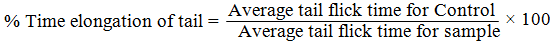 Each mouse was kept in a particular restrainer with only the tail extending out. Afterwards 1/3rd of its tail was submerged in a digital constant temperature water tank maintained at 51 °C. The 1st reading was taken straightaway prior to the administration of drugs and then after 30, 60, 90, 120, 150 and 180 min. Animals which did not remove their tail in 10 seconds were discarded from the experiment in order to avoid tissue damage [24]. Data acquired was calculated utilizing the average values of every group and average increase in latency following dosing was measured. Lastly % time elongation of tail with respect to the control group was evaluated using the following formula as previously described [25].