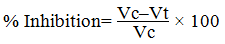 30 min after the administration of drugs, 0.7% acetic acid 10 ml/kg was given IP. Mice were placed immediately in a plastic transparent box (13 cm height×12 cm width×23 cm length) and number of writhes which includes abdominal muscle contraction, periodic arching of body, stretching and drawing up of hind limbs were counted for twenty minutes and lastly percent inhibition of writhes was assessed using the following formula [21].