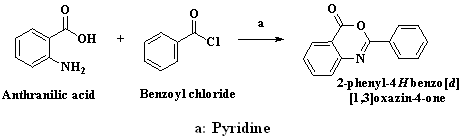 Anthranilic acid solution was prepared by adding 6.85 g (0.05 mol) of anthranilic acid to 60 ml of pyridine. To this mixture 5.67 ml (0.05 mol) of benzoyl chloride was added drop wise at 0-2 ° Ϲ for 2 h. Reaction mixture was stirred for 2 h. The reaction mixture was neutralized with saturated sodium bicarbonate solution and solid product was filtered and re-crystallized from ethanol. The reaction step is depicted in (fig. 1).