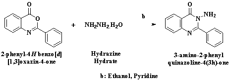 2.2 g (0.01 mol) of 4H-benzo[d] [1, 3] Oxazin-4-one was dissolved in ethanol and 0.5 ml (0.01 mol) of hydrazine hydrate was added to it with catalytic amount of pyridine. Reaction mixture was refluxed for 1 h and after cooling a crystalline product was filtered and re-crystallized from ethanol. The reaction step is depicted in (fig. 2)
