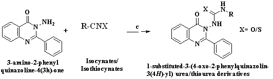 Prompted by these findings and medicinal importance of quinazolinone we report here the synthesis of novel analogues of 1-substituted-3-(4-oxo-2-phenylquinazolin-3(4H)-yl) urea and thiourea derivatives as potential bioactive molecules.