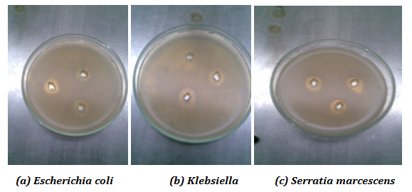 Fig. 4: Zone of inhibition (mm) for (a) E. coli, (b) Klebsiella, (c) Serratia marcescens