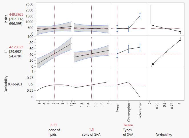 Applying the desirability function of the used software gave rise to a new formula F19 with the following composition: 6.25% GMS and 1.5% tween 80. This formula was the most optimized formula in the model (table 2). Fig. 1 illustrates the composition of the optimized formula F19 as well as its expected values of particle size and EE%.