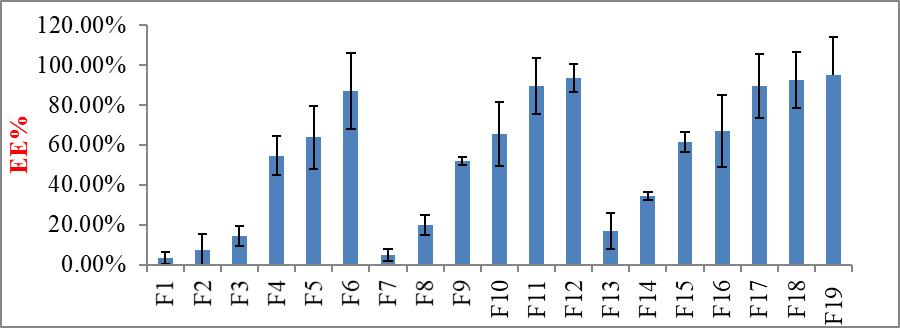 EE% was the second dependent variable selected to study the effect of different formulation variables and their interactions. The results are listed in table 3 and illustrated in fig. 3.