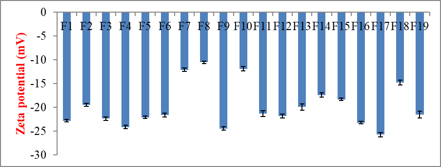 The results of TFH SLNs zeta potential of different formulae are shown in table 3. The values of zeta potential were between-10.50 mV and-24.43 mV.