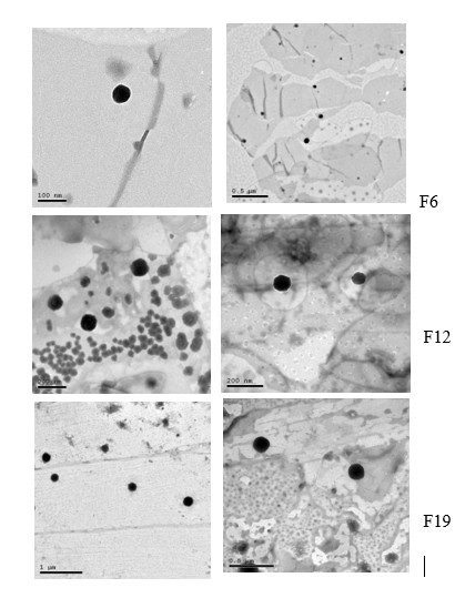 Optimized formulae were selected for studying their surface morphology as they show suitable particle size with the best EE%. The morphology of fresh TFH SLNs was observed using TEM. Morphology TEM was shown in fig. 4 for F6, F12, and F19.