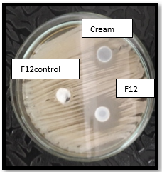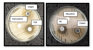 Fig. 7: Microbiological agar plate showing zones of inhibition induced by F6, F12, and F19 formulae, plain formula (control), and the marketed product, (n= 3±SD)