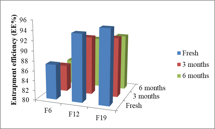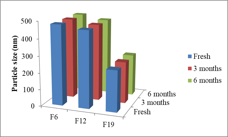 The optimized SLNs formulae were stored under ambient conditions for 3 and 6 mo at 25 °C. They were re-evaluated for their particle size and EE%. A slight increase in the particle size diameter (fig. 8) and slight decrease of EE% (fig. 9) were observed; both were statistically non-significant (P>0.05, paired t-test), proving the stability of TFH loaded SLNs.