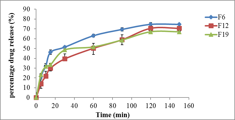 After a complete analysis of the factorial design with the previously set levels of the selected independent variables and their effect on the selected important dependant variable of particle size and EE%, the two optimum criteria set were suitable particle size and highest EE%. Suitable PDI was also taken into consideration. According to these criteria, the three optimum formulae (F6, F12, and F19) were selected for further evaluation.