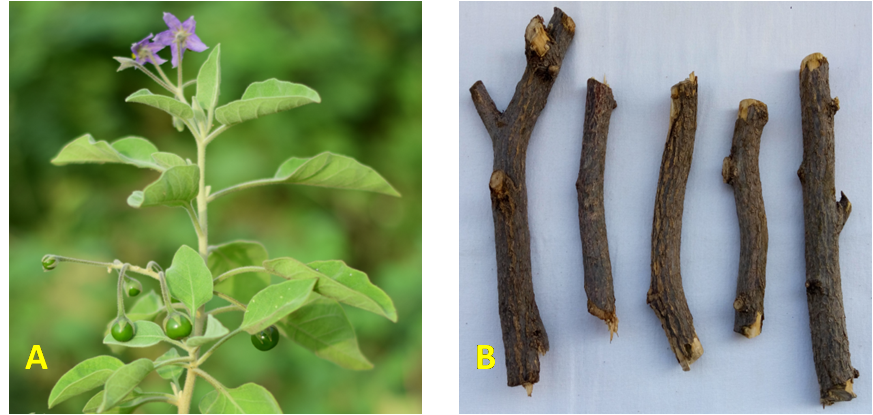 Fig. 1: A. Habit of S. pubescens, the source of leaf material, B. The stem with bark