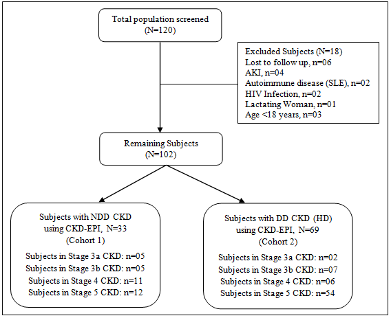 The study was conducted on 120 patients with presumed and/or confirmed CKD with HTN, but 18 patients were excluded based on the inclusion and exclusion criteria. 06 patients were lost to follow up, 12 patients were excluded after clinical judgment (AKI, Autoimmune disease, Current Infection, and Lactating woman; age<18). The remaining 102 patients were evaluated during the study.