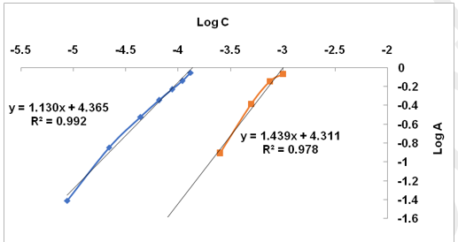 The stoichiometry of the reaction between Methimazole and KMnO4 in alkaline medium was determined by adopting the limiting logarithmic method [42]. Two sets of experiments were performed. The first set of experiments was carried out using increasing concentrations of methimazole (8.76×10-6-1.3×10-4M) at fixed permanganate concentration (1.5×10-3 M). The second set of experiments was carried out using increasing concentrations of permanganate (2.5×10-4-1.5×10-3 M) at fixed methimazole concentration (1.3×10-4 M). The logarithms of the absorbance values were plotted against the logarithms of the methimazole and KMnO4 concentration in the first and second set of experiments, respectively. Two straight lines were obtained. The slopes of the fitting lines were calculated (fig. 3).