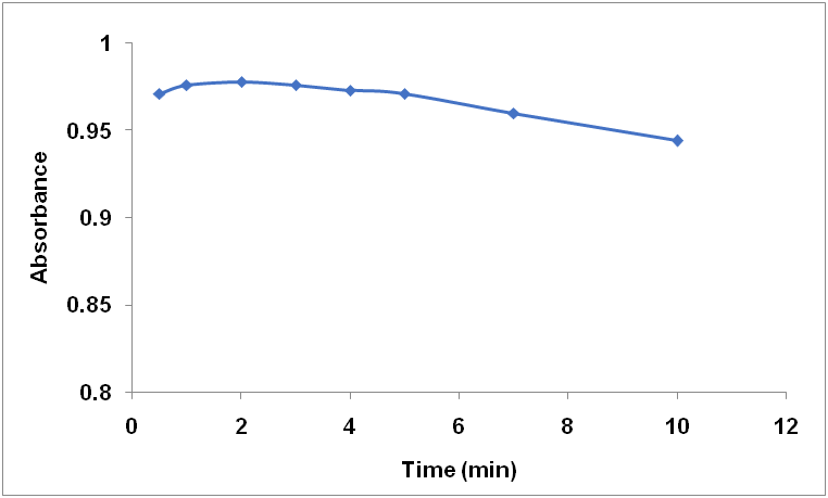 Fig. 5: Effect of time on the absorbance value of the reaction product of 15 µg/ml methimazole at 610 nm