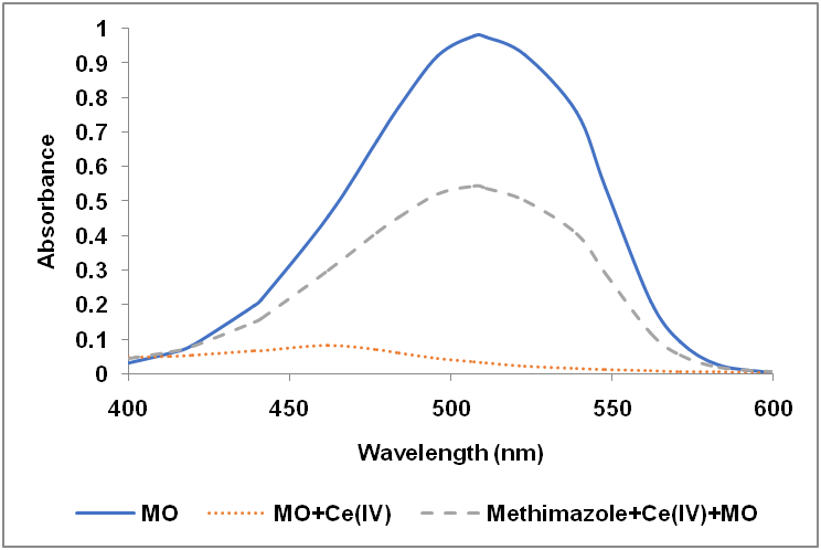 In this method, Methimazole was allowed to react with a known excess of Ce (IV) nitrate in acidic medium. The unreacted Ce (IV) was reacted with excess methyl orange and the residual methyl orange was determined by absorbance measurement at λmax 507 nm [40]. In the presence of increasing amounts of the oxidant Ce (IV), the absorbance values of methyl orange decreases. Once the oxidation reaction is assured complete; the unreacted Ce (IV) amount is inversely proportional to the methimazole amount in the sample. According to the scheme below, with increased methimazole concentration, the amount of unreacted Ce (IV) bleaching methyl orange was less and thus the solution absorbance value increases linearly with methimazole concentration (fig. 6).