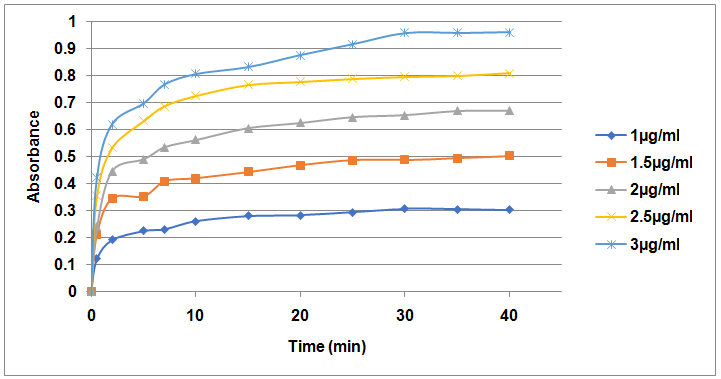 Fig. 7: Absorbance-time curve for the oxidation reaction of methimazole (1-3 µg/ml) by Ce (IV) in acidic medium