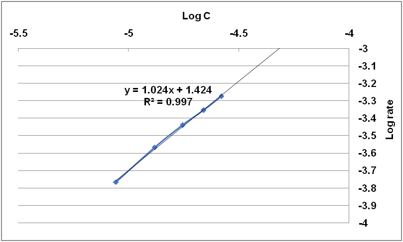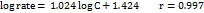 Regression of log (rate) versus log [C] by least square method generates the calibration equation of: