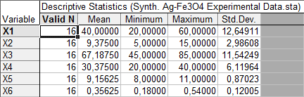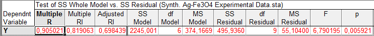 The process of statistical processing of the results of experimental studies was divided into two stages: 1) study of the relationship between the yield of the nanocomposite Ag@Fe3O4 (dependent variable Y) and the independent variables (X1–X6) (table 1) with the determination of the correspondence of the selected linear model to the experimental results; 2) a search for optimal conditions for the production of the nanocomposite Ag@Fe3O4.